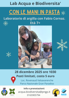 Un laboratorio creativo dedicato ai più piccoli per sperimentare la lavorazione dell’argilla e dare forma alle proprie idee con le mani. L’attività è condotta da Fabio Cornaz ed è pensata come un momento di scoperta, manualità e condivisione, all’interno delle iniziative del Lab Acqua e Biodiversità di Rovenaud-Valsavarenche.