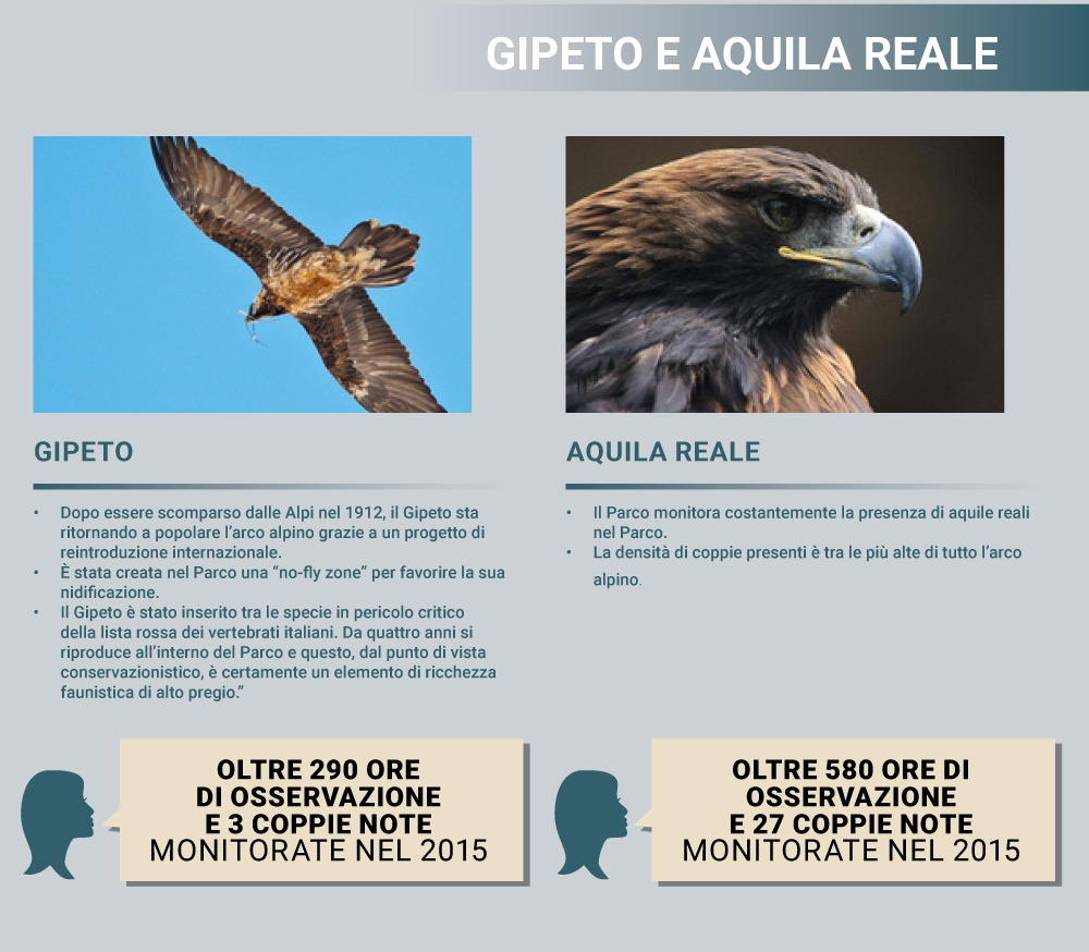 Sono presenti nel Parco quasi tutte le specie di uccelli tipiche dell’ambiente alpino. Insieme all’aquila reale e al gipeto, i rapaci che sono osservati ogni anno sono l’astore e le civette capogrosso e nana; insieme a loro la coturnice, il fagiano di monte, il gracchio corallino, la nocciolaia e la pernice bianca abitano gli ambienti alpini dell’area protetta.