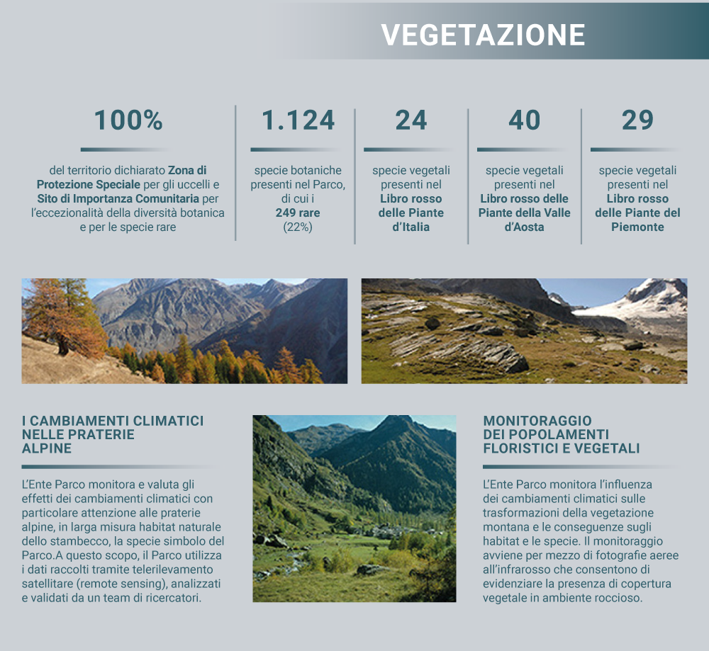 Il Parco Nazionale Gran Paradiso protegge un'area caratterizzata da un ambiente di tipo prevalentemente alpino. I boschi ricoprono circa il 20% della superficie, sono l’habitat di un gran numero di specie animali, e costituiscono un sistema naturale di difesa dal dissesto idrogeologico (frane, valanghe, esondazioni).