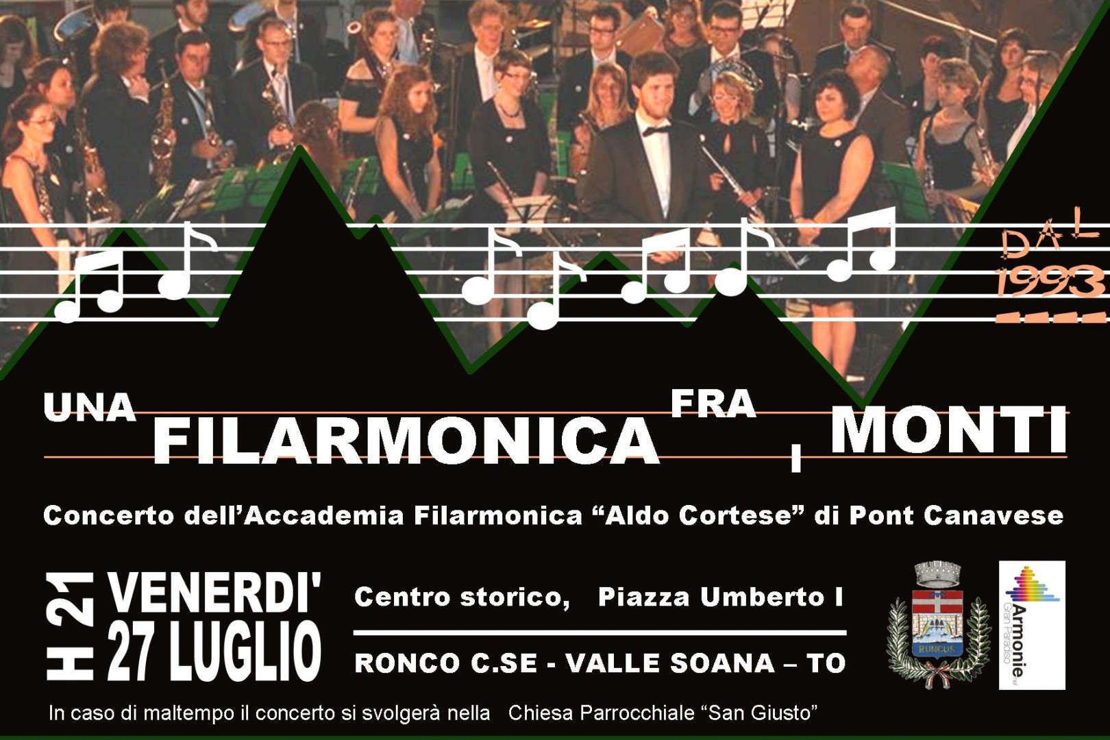 - Ore 21:00 – Centro storico, piazza Umberto I – “Una filarmonica fra i monti”. Nella cornice del centro storico del paese, i viottoli illuminati dalle lanterne introducono ad una piazzetta lastricata di lose su cui si erge il campanile di San Giusto. Nel palcoscenico della piazza Umberto I sotto il balconcino di gerani rossi, si esibisce la Filarmonica Aldo Cortese di Pont Canavese. Il concerto, interpretato da un’orchestra di ottoni, corde e percussioni e diretto dal maestro Gianluigi Petrarulo, condurrà i partecipanti in un viaggio nella musica a 360°: dai pezzi dei grandi classici di Beethoven e Mozart alle colonne sonore cinematografiche di oggi. La serata è un’occasione per visitare il capoluogo e le borgate del comune di Ronco Canavese, da quest’anno Comune fiorito del Parco Nazionale Gran Paradiso. In caso di maltempo il concerto si svolgerà nella Chiesa di San Giusto.