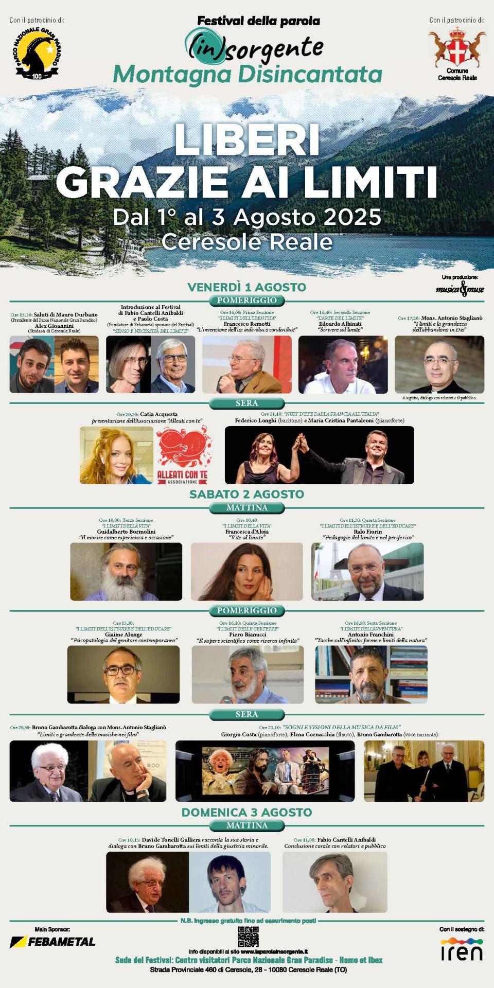 Questa edizione, dal titolo “Liberi grazie ai limiti”, costituirà un’occasione di approfondimento e confronto su temi di grande attualità: identità, arte, istruzione, spiritualità. Organizzato con il patrocinio del Comune di Ceresole Reale e del Parco Nazionale Gran Paradiso, l’evento propone varie sessioni tematiche quotidiane, cui si affiancano momenti di musica e dialogo con il pubblico.
