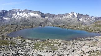 Lago Djuan con sullo sfondo il Gran Nomenon e la Grivola dal vallone del Nampio.