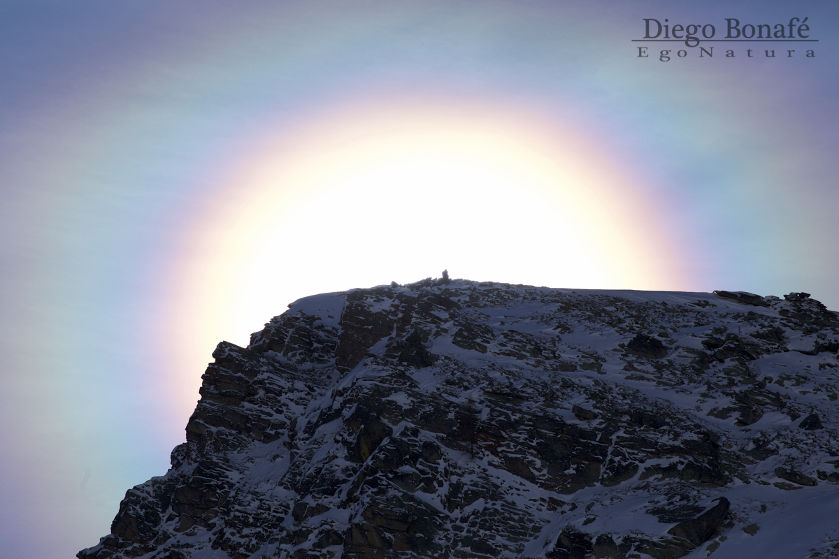 Il sole dietro la vetta a creato quest'aura colorata, credo sia dovuta ai cristalli di ghiaccio in sospensione - parco nazionale Gran Paradiso - nessuna modifica dei colori è stata apportata alla foto.