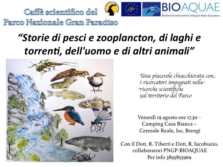 19/08 ore 17:30 Campeggio Casa Bianca – Ceresole Reale (Valle Orco): "Storie di pesci e zooplancton, di laghi e torrenti, dell'uomo e di altri animali"