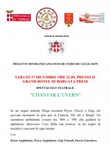 Nell’ambito del progetto “minoranze linguistiche storiche”, il 27 dicembre si terrà a Ceresole Reale (TO) lo spettacolo teatrale “Chantar l’uvern”. Appuntamento alle ore 21 presso il Grand Hotel di borgata Prese.