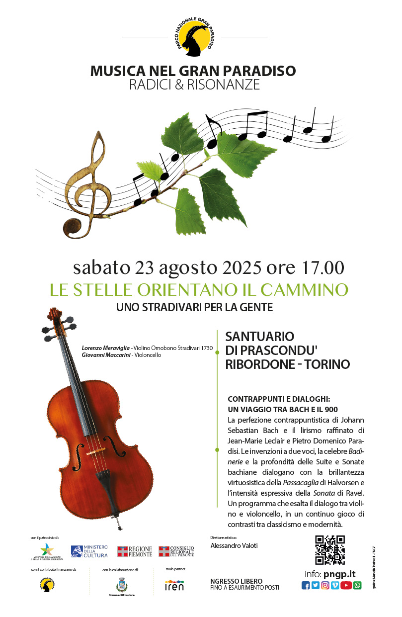 Nell’ambito della rassegna Musica nel Gran Paradiso: Radici e Risonanze è in programma l’evento Le stelle orientano il cammino. Appuntamento sabato 23 agosto 2025 alle ore 17 presso il santuario di Prascondù - Ribordone.
