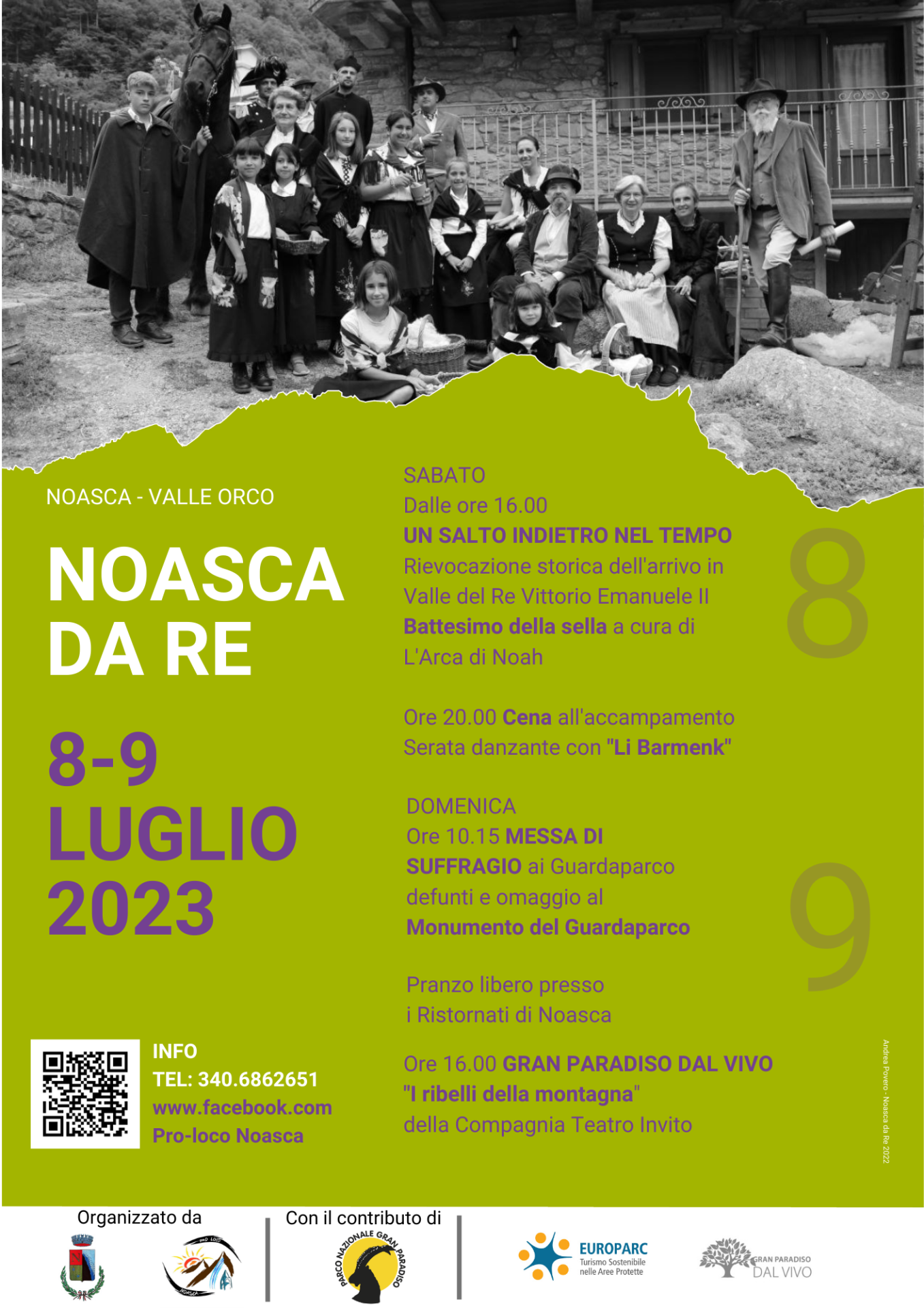 Sabato 8 e Domenica 9 luglio 2023 si terrà la XIII edizione della rassegna dedicata alla storia che ricorda le frequentazioni del re Vittorio Emanuele II per le sue battute di caccia, che potevano durare anche settimane e che richiedevano di soggiornare presso strutture in quota. L’evento “Noasca da Re” racconta questa storia: due giorni per rivivere l’atmosfera dell’epoca!