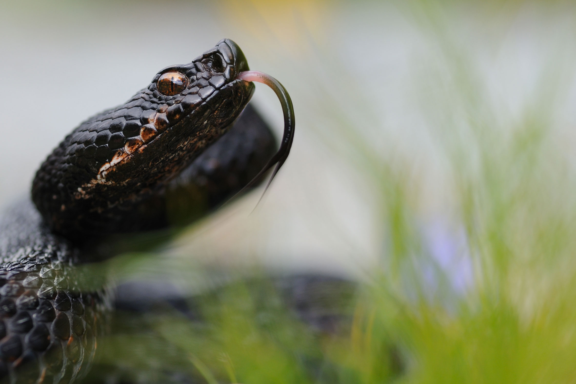 verde e rocce. Vipera aspis”, primissimo piano di una vipera in forma nera