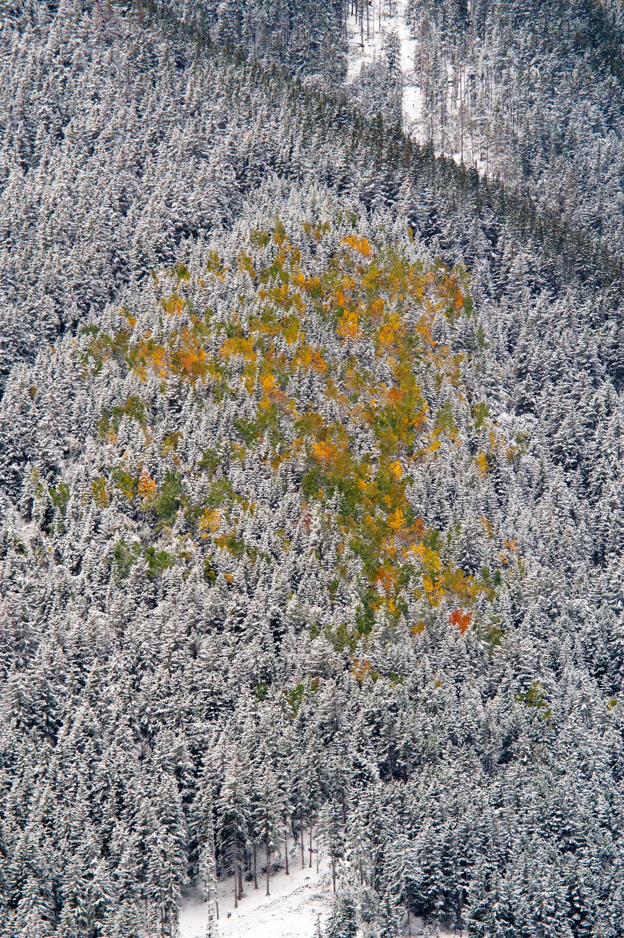 delicato contrasto tra betulle e abeti dopo una nevicata precoce.