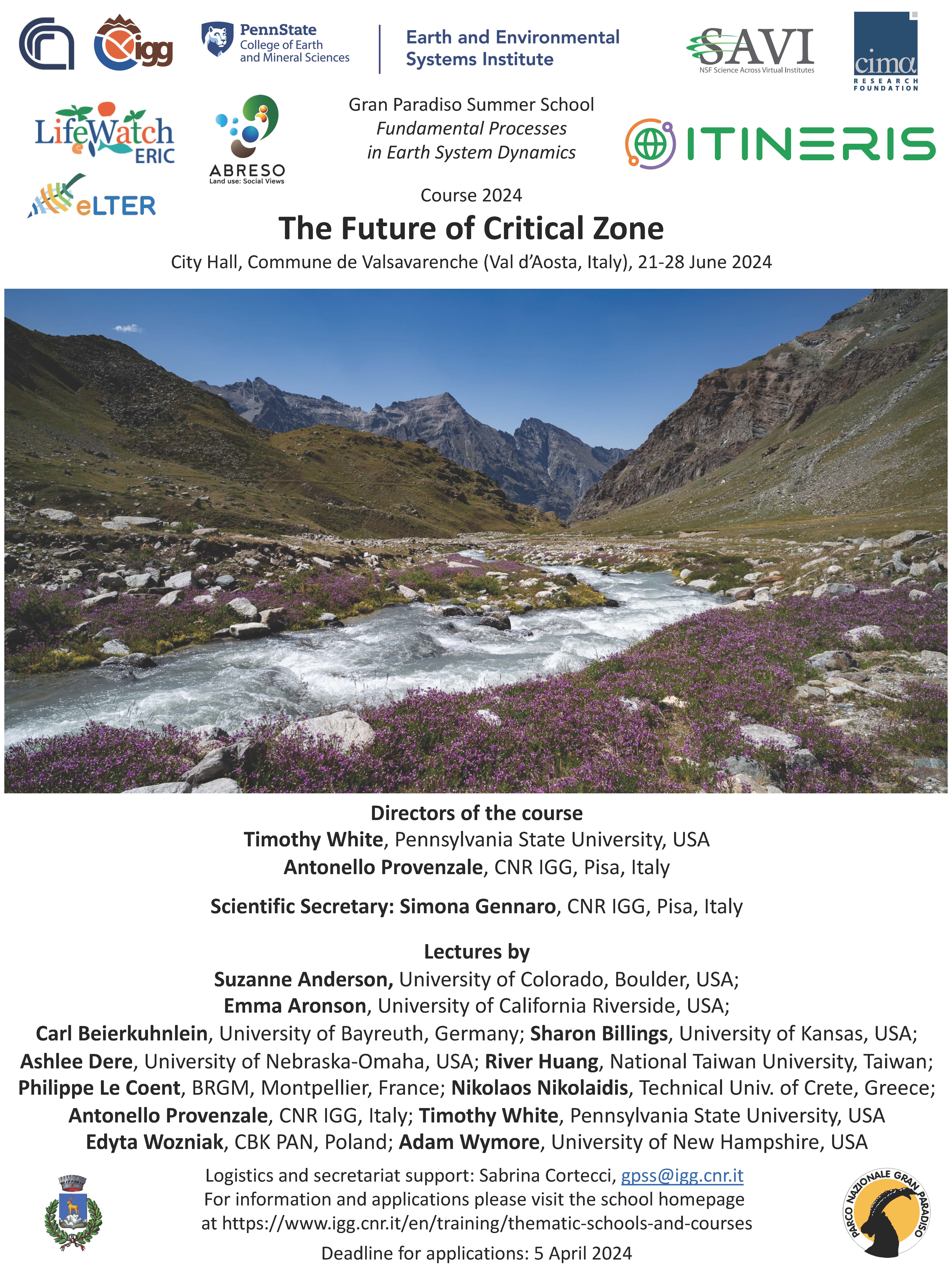 La scuola vedrà la presenza di numerosi docenti italiani e internazionali: Suzanne Anderson (Università del Colorado), Emma Aronson (Università Riverside della California), Carl Beierkuhnlein (Università di Bayreuth), Sharon Billings (Università del Kansas), Ashlee Dere (Università del Nebraska-Omaha), River Huang (Università Nazionale di Taiwan), Philippe Le Coent (BRGM di Montpellier), Nikolaos Nikolaidis (Università Tecnica di Creta), Antonello Provenzale (CNR-IGG), Timothy White (Università Statale della Pennsylvania), Edyta Wozniak (CBK PAN, Polonia), Adam Wymore (Università del New Hampshire).