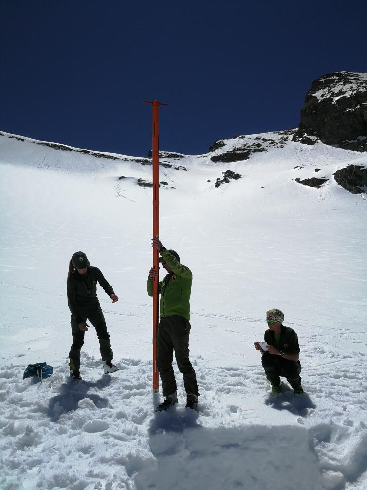 Giovedì 30 maggio sono state effettuate le misurazioni al ghiacciaio del Grand Etrèt, nel versante valdostano del Parco. Sono stati 12 i guardaparco impegnati nelle rilevazioni, gli accumuli registrati nei cinque pozzi, scavati in prossimità delle paline ablatometriche, hanno visto un minimo di 470 ed un massimo di 550 cm, per un totale stimato di 871.600 metri cubi di neve caduta in un anno.