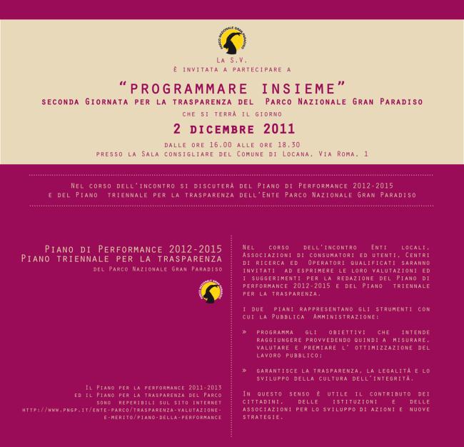Venerdì 2 dicembre dalle 16 alle 18.30 presso la Sala consigliare del Comune di Locana, Via Roma, 1 si terrà la seconda Giornata per la trasparenza del Parco Nazionale Gran Paradiso "Programmare insieme". Nel corso dell’incontro si discuterà del Piano di Performance 2012-2015 e del Piano triennale per la trasparenza dell’Ente Parco