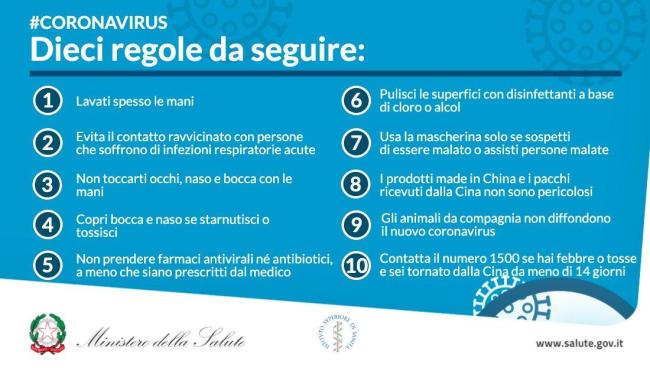 In base alla direttiva 1/2020 del Ministero per la Pubblica Amministrazione avente oggetto: prime indicazioni in materia di contenimento e gestione dell'emergenza epidemiologica da COVID-2019 nelle pubbliche amministrazioni al di fuori delle aree di cui all'articolo 1 del decreto-legge n.6 del 2020, si pubblicano le informazioni di prevenzione rese note dalle autorità competenti.