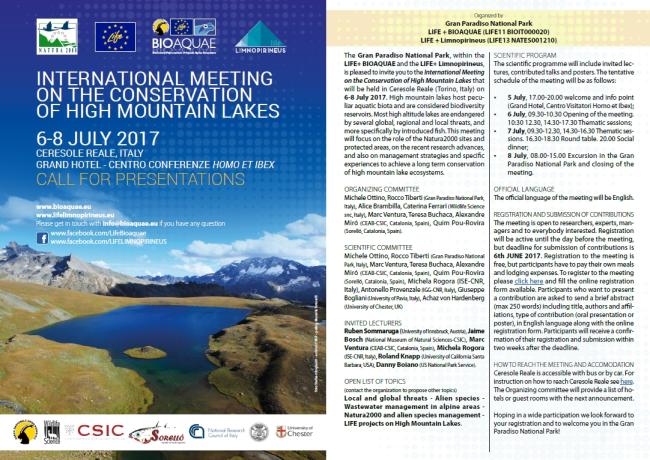 Dal 6 all'8 luglio 2017 a Ceresole Reale si terrà il Meeting Internazionale sulla conservazione dei laghi di montagna organizzato nell'ambito dei progetti Life+ Bioaquae e Life Limonopirineus
