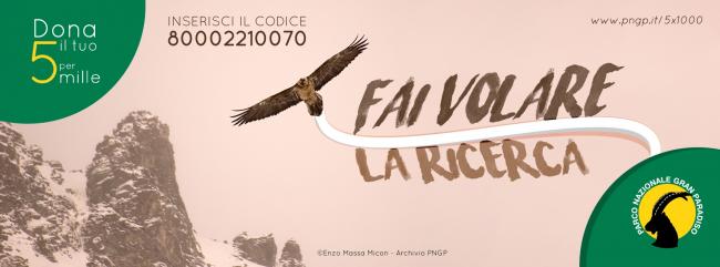 Anche per il 2017 è possibile donare il proprio 5 per 1000 a sostegno della ricerca scientifica del Parco. Basta apporre la propria firma nel riquadro "Finanziamento della ricerca scientifica e della università" del modello Unico Persone Fisiche, Modello 730, oppure nella scheda allegata al CUD per tutti coloro che sono dispensati dall’obbligo di presentare la dichiarazione, ed inserire il codice fiscale del Parco 80002210070.