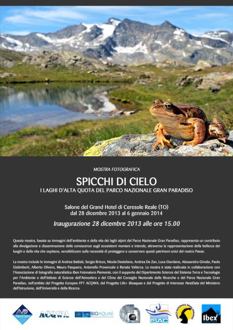 Dal 28 dicembre 2013 al 6 gennaio 2014, presso la sala polivalente del centro Visitatori del Parco “Homo et Ibex” a Ceresole Reale (TO), si terrà la mostra fotografica "Spicchi di cielo: i laghi d’alta quota del Parco Nazionale Gran Paradiso” a cura di Nicola Destefano, Andrea De Zan e Antonello Provenzale.