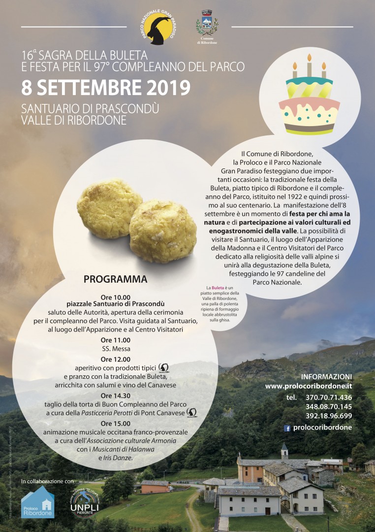 All'inizio della Valle Orco si diparte una valle del Parco completamente immersa nella natura più selvaggia: è la valle di Ribordone. La sagra, organizzata dalla Pro Loco di Ribordone, nasce dall’idea di dare risalto alle tradizioni locali per far rivivere la vita di un tempo con attività per tutti degustando la "buleta", una palla di polenta ripiena di formaggi fatta abbrustolire sulla ghisa.