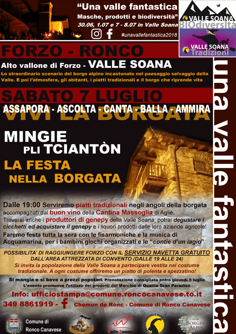 - Dalle 18:00 – RONCO CANAVESE, borgata Forzo: “MINGIE PLI TCHANTON”: la festa è… Assaporare i piatti e i prodotti della tradizione valsoanina, ascoltare le musiche popolari e le storie degli abitanti. Cantare, unendosi al gruppo. Osservare i costumi e gli abiti tradizionali, le architetture, il paesaggio intorno. Ballare, insieme agli abitanti del borgo. Vivi la borgata! Navette gratuite dall’area attrezzata della località Convento. Informazioni e prenotazioni: Comune di Ronco Canavese ufficiostampa@comune.roncocanavese.to.it - Associazione “Li Fòsatin” – 349 886 1919