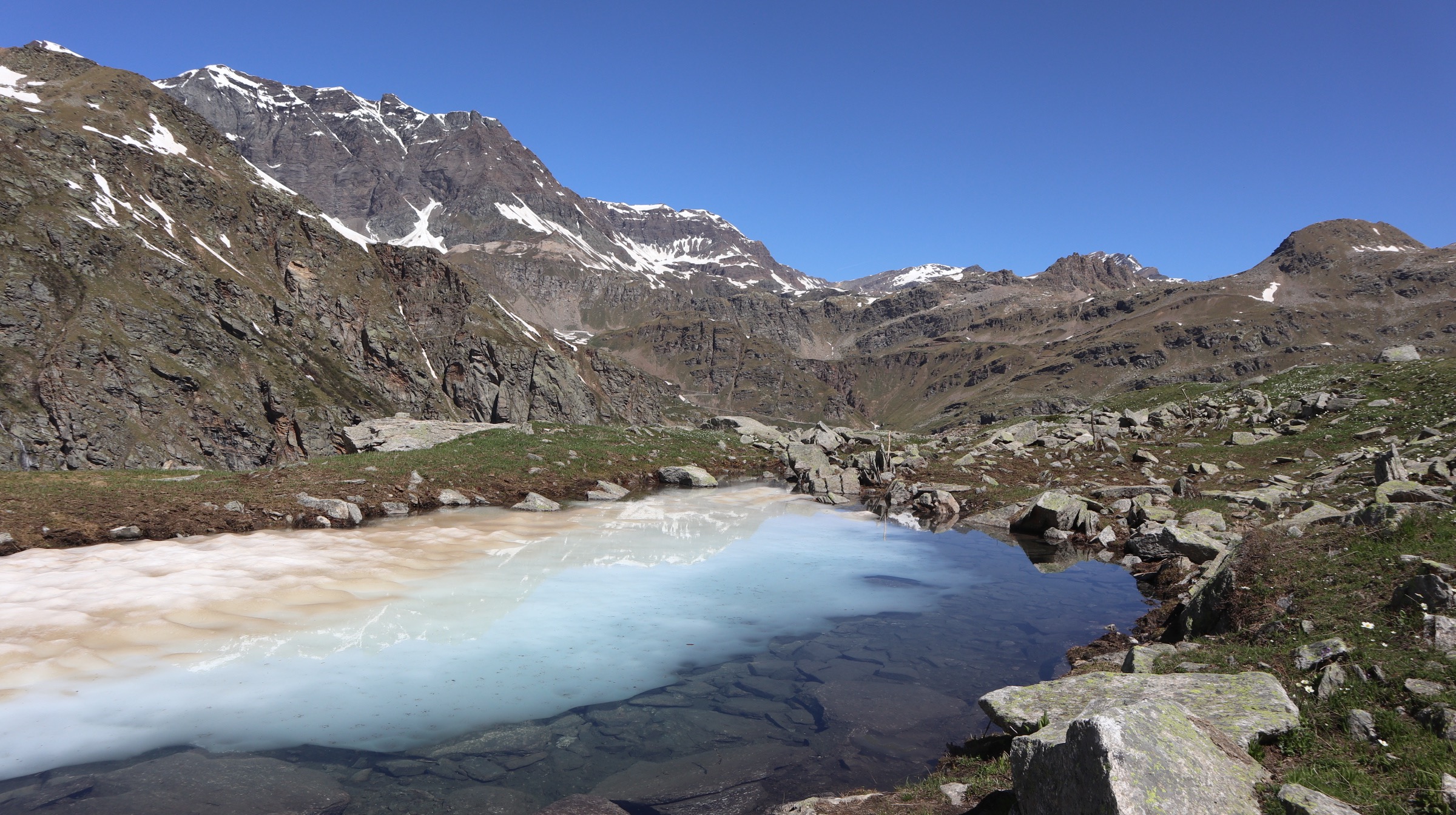 Uno dei laghetti dell'Alpe Cernera con uno sguardo verso il Nivolè