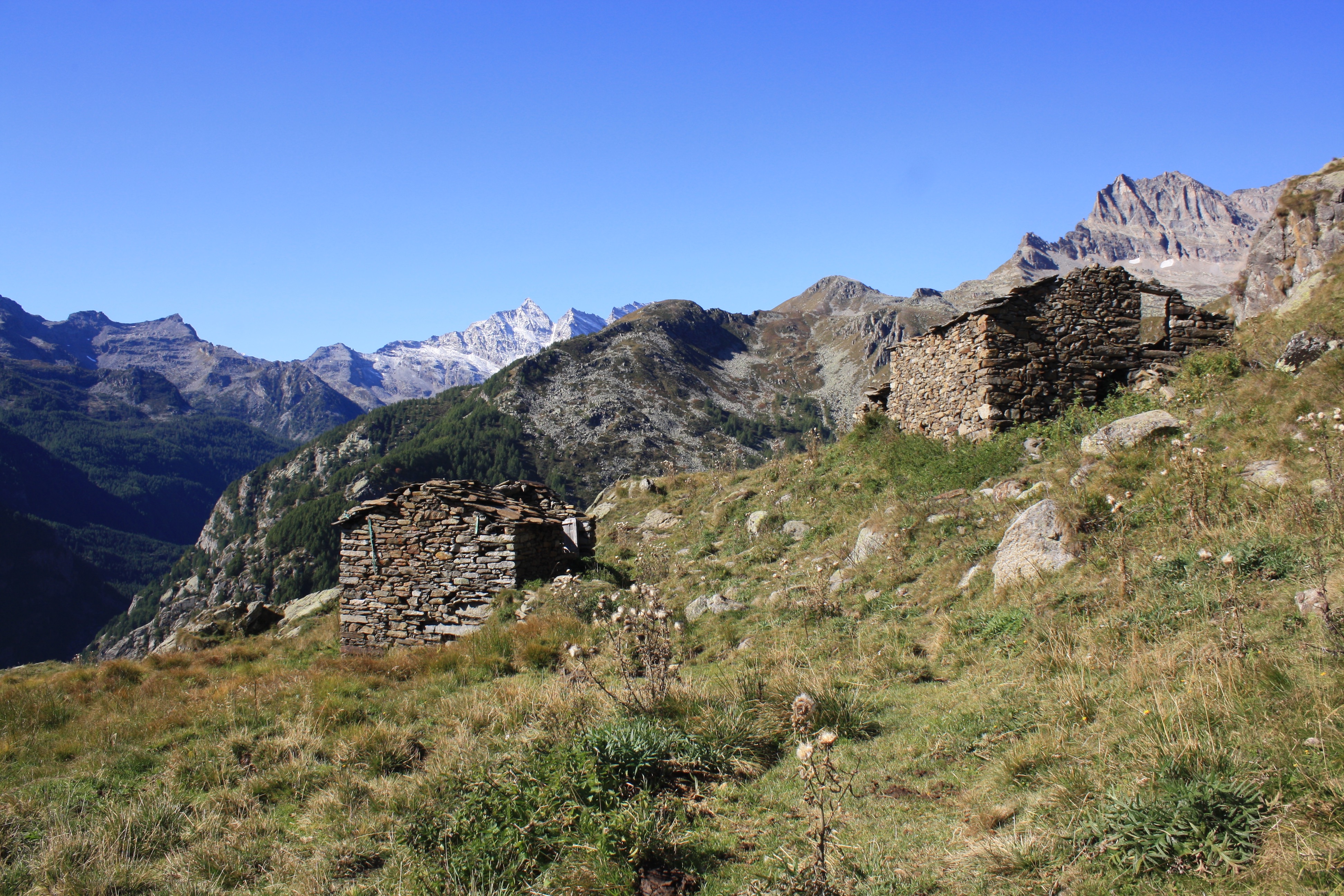 Vecchi alpeggi nei pressi dell'Alpe Ramajot, con sullo sfondo la Levanna Orientale